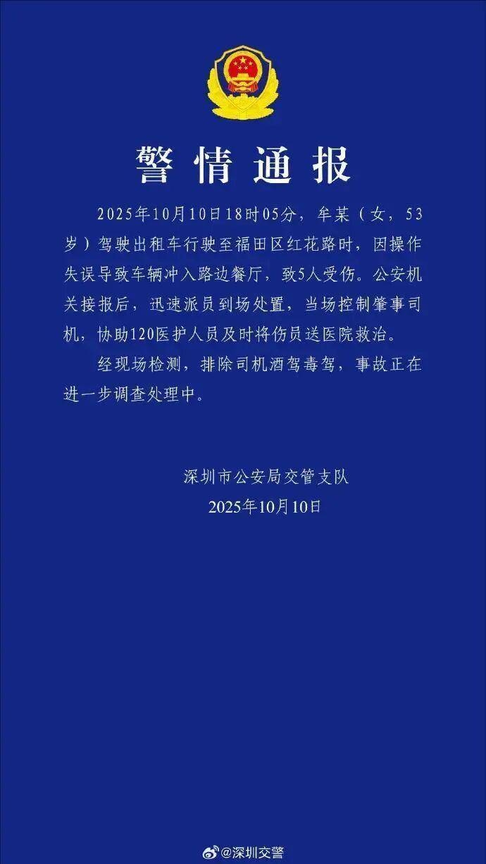 深圳警方通报:53岁女子驾驶出租车操作失误导致车辆冲入路边餐厅,5人受伤